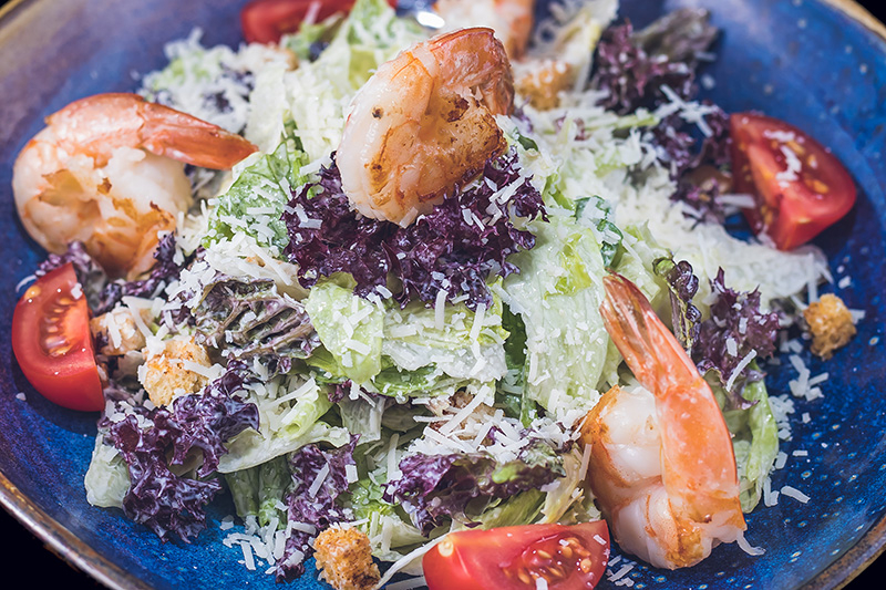 mix of green salads, iceberg, shrimps, cherries, parmesan, herb croutons, Caesar sauce 350 gr.